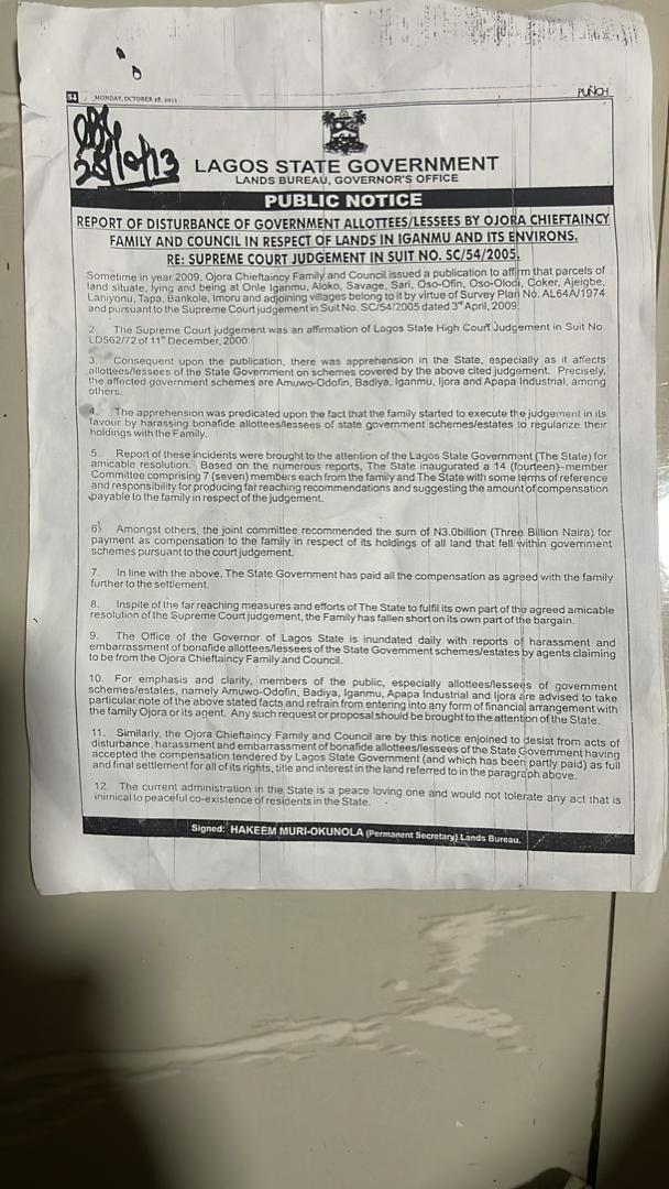 The public notice posted on the entrance of the property indicated that ” public notice with heading “To all defaulters tenants and occupiers on Ojora Royal Family and council adjudged landed property pursuant to the several court judgements”.