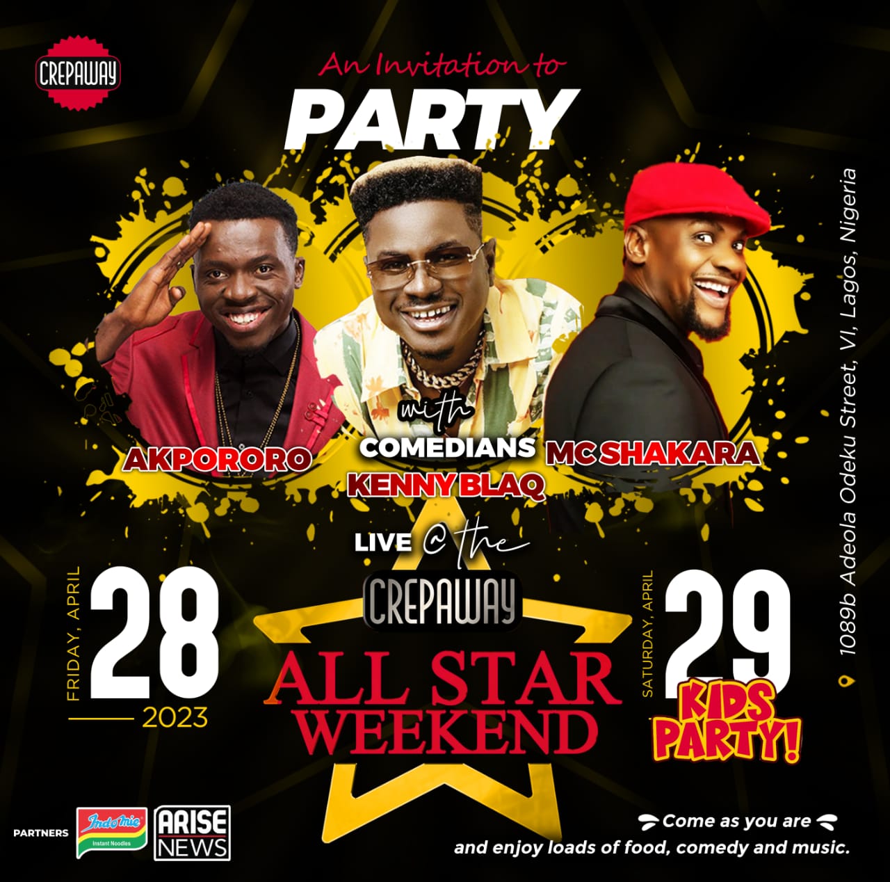 Comedian Akpororo, MC Shakara and KennyBlaq will be thrilling guests and fans with comedy while they enjoy their best dishes on Friday 28th while the All-Star Kids Party, a free event for kids holds on Saturday 29th at 1 pm at the Crepaway Kids Corner, a Kids play area and events center, creating memorable experiences kids treasure. Guest appearances from other Nollywood celebrities and influencers are expected to spice up the occasion and add to the thrill and moments of laughter, food and music.