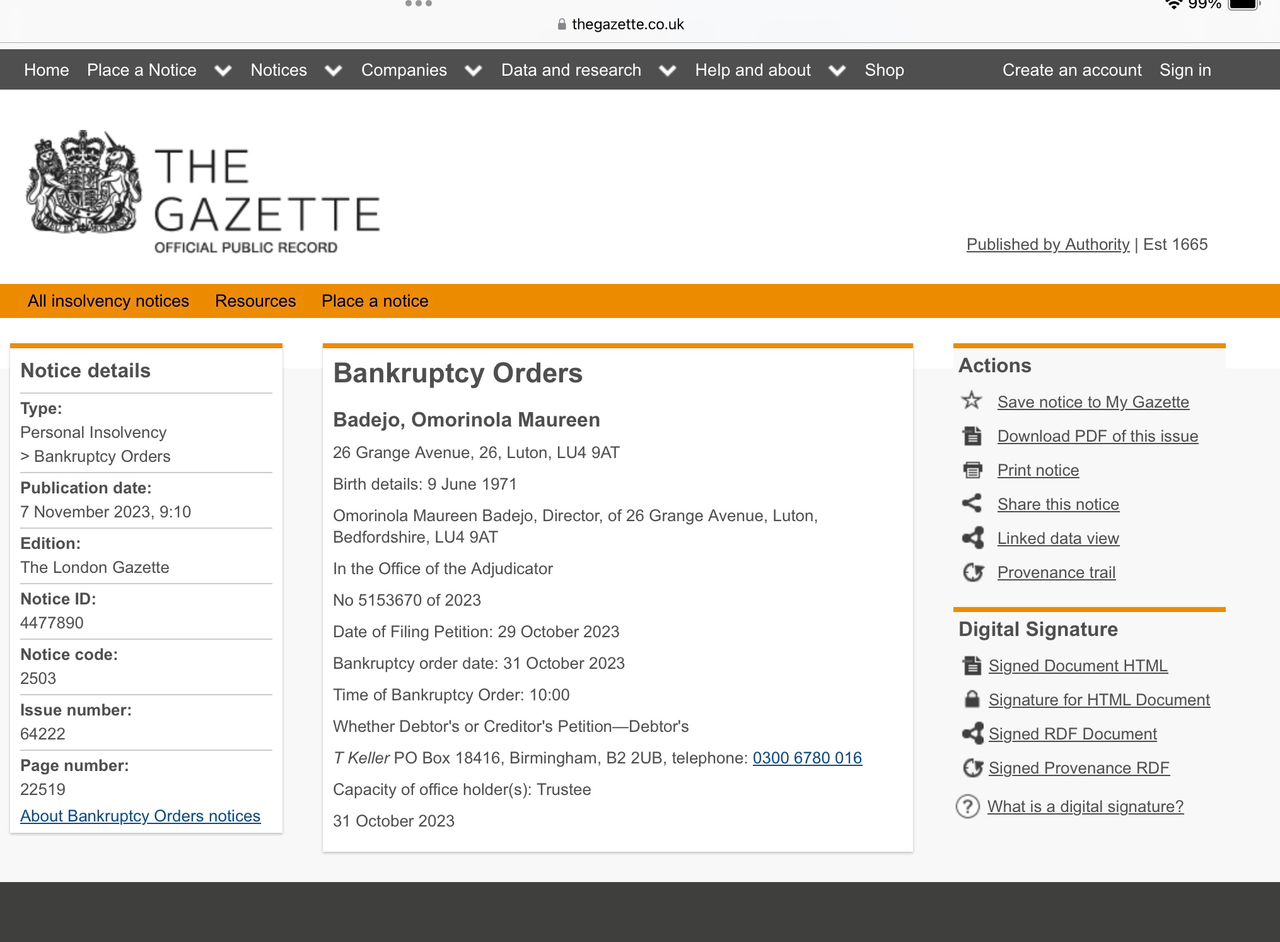 We found out that by October 31, 2023, her application for self-bankruptcy was granted by the UK government. In short, MAUREEN BADEJO IS NOW OFFICIALLY BANKRUPT IN THE UK and same has been duly registered against her in the UK system as a chronic DEBTOR. Find below the document to prove this