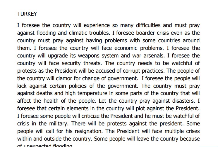 ‘’ TURKEY: I foresee the country will experience so many difficulties and must pray against flooding and climatic troubles. I foresee a border crisis even as the country must pray against having problems with some countries around them. I foresee the country will face economic problems. I foresee the country will upgrade its weapons system and war arsenals. I foresee the country will face security threats. The country needs to be watchful of protests as the President will be accused of corrupt practices. The people of the country will clamor for a change of government.’’