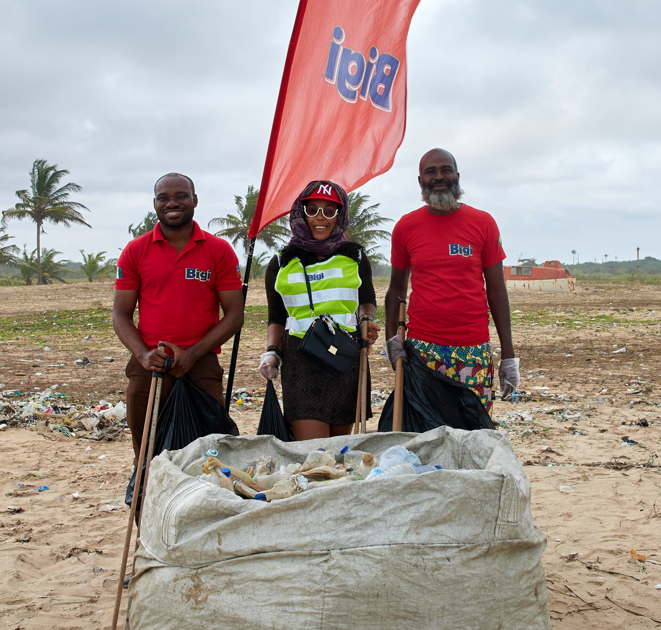 From Left: Kalu Emeka Michael, Events and Activation Officer, Rite Foods Limited; with Victoria Aliu, Volunteer, and Akin Disu, Founder, Popbeachclub; during the clean-up exercise at Tarkwa Bay beach in Lagos, as part of Rite Foods Corporate Social Responsibility (CSR) initiative, Riteonthebeach, aimed at environmental preservation, held on Saturday, 26 August, 2023.